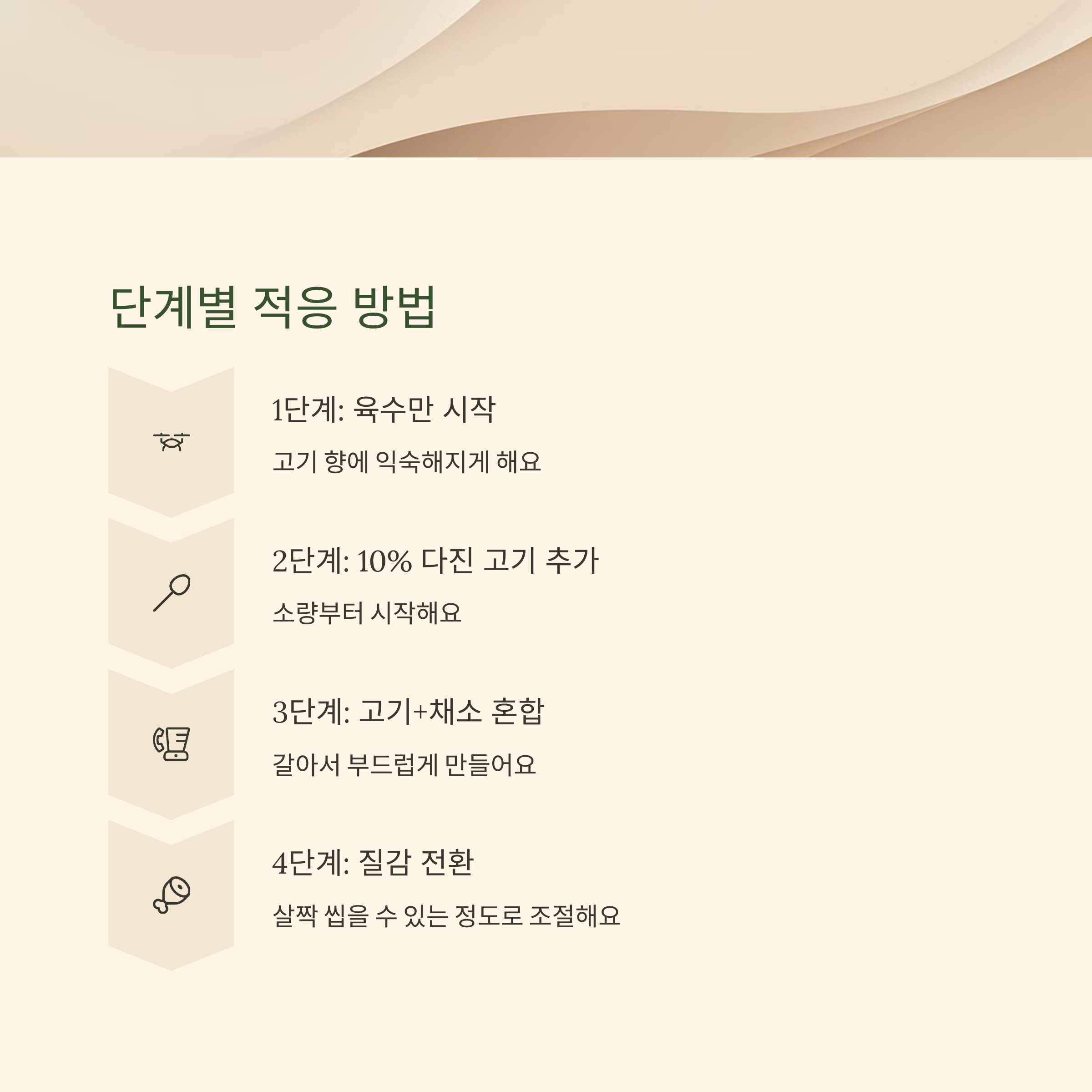 - 🍼 고기육수만 먼저 먹이기 → 고기 퓨레 추가 방식으로 점진적 전환
