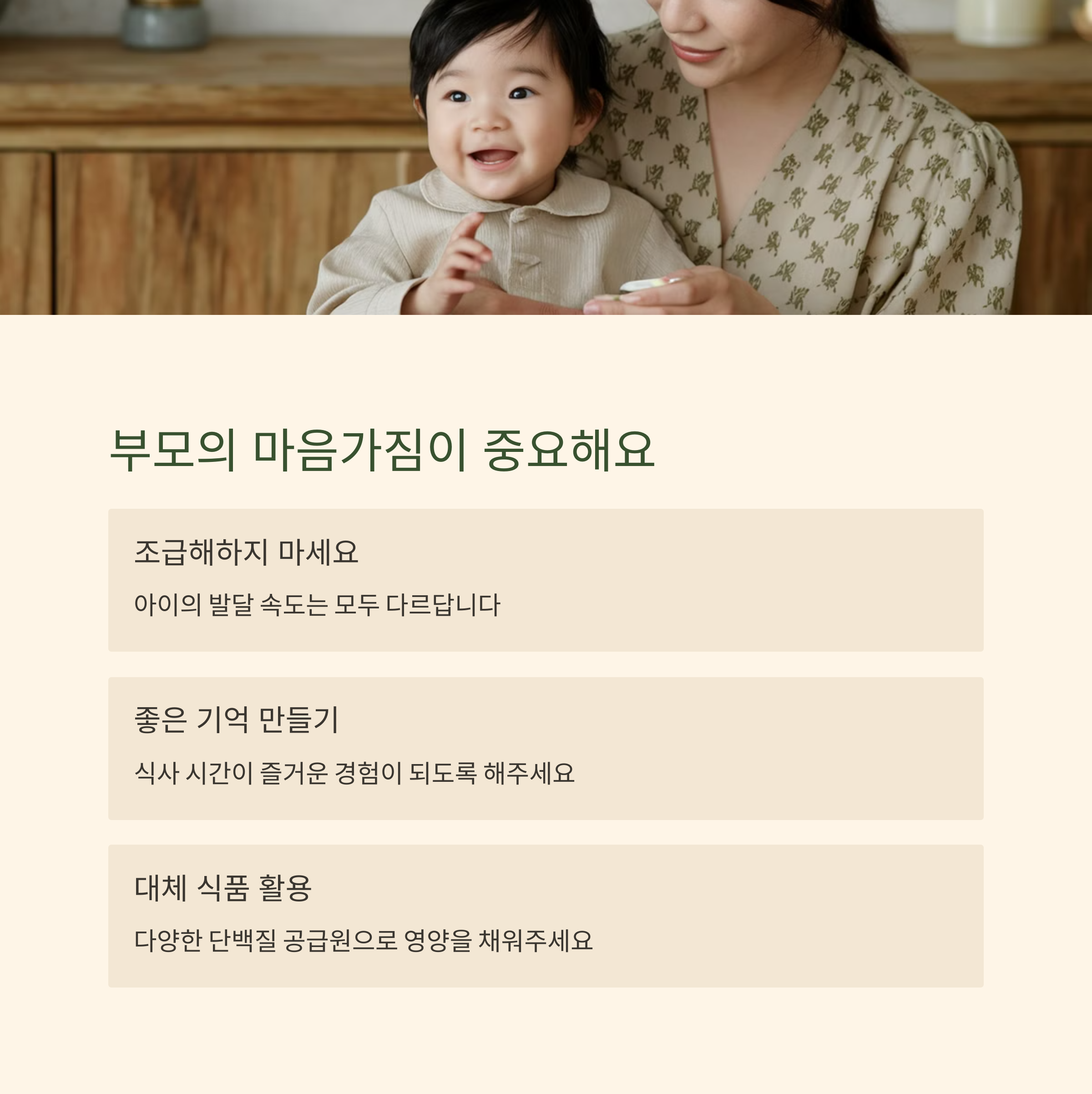 아이의 영양 섭취는 물론 중요하지만, 무엇보다 중요한 건 식사에 대한 좋은 기억입니다. 억지로 먹이면 아이는 음식 자체를 싫어하게 되고, 이는 장기적인 식습관에 영향을 줘요. 고기를 거부하더라도 충분히 대체 식품과 놀이, 조리법으로 보완이 가능하니 너무 조급해하지 마세요. 저도 ‘우리 아이는 고기를 싫어하는 아기가 아니라, 고기와 친해지는 중인 아기’라고 생각하며 천천히 기다려줬어요. 🍀