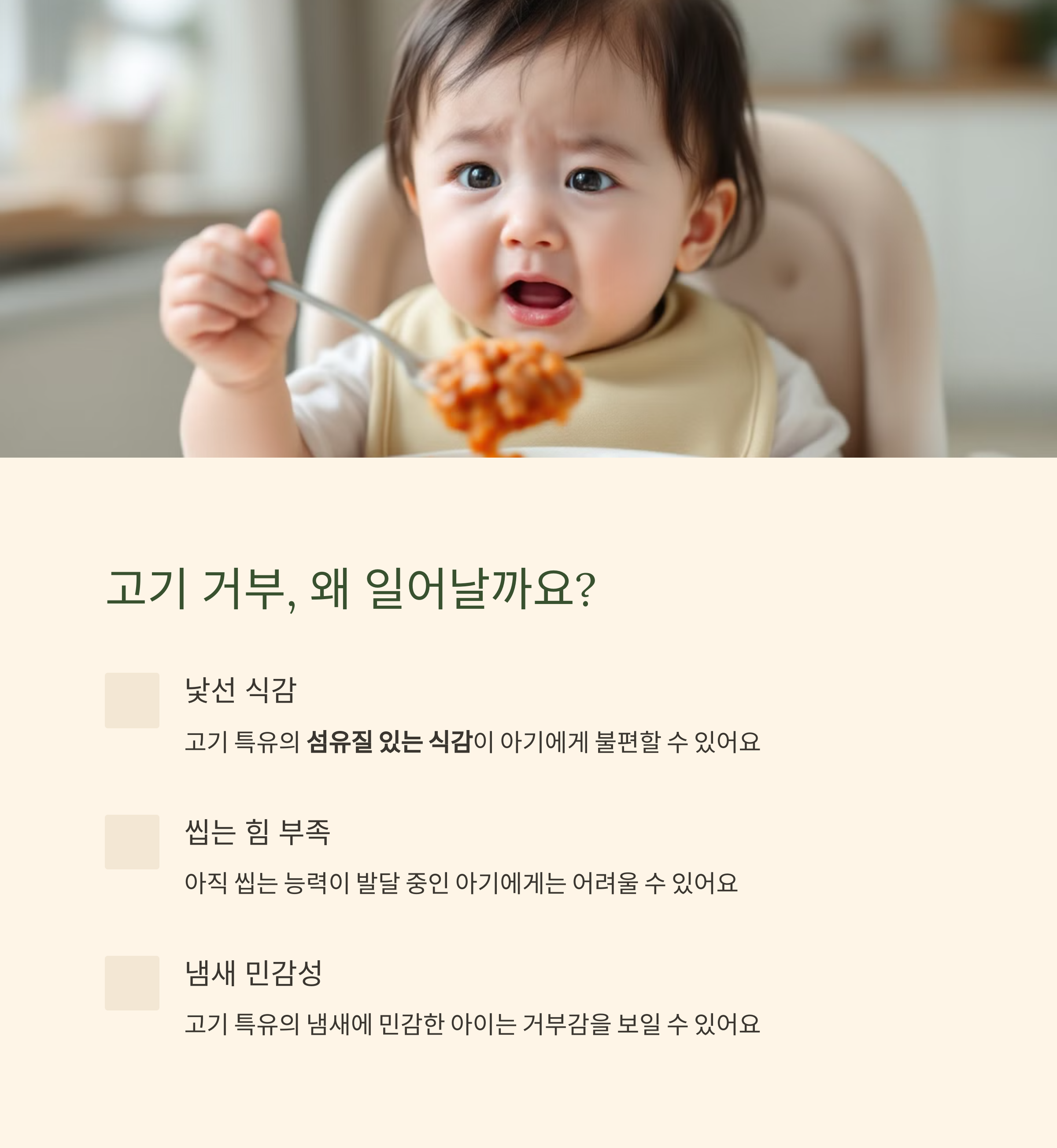 고기 특유의 섬유질 있는 식감은 아기 입장에서 매우 낯설고 불편할 수 있어요. 특히 씹는 힘이 부족하거나, 고기의 냄새와 질감에 민감한 아이라면 더더욱 뱉을 수 있죠. 저희 아이도 소고기 퓌레를 처음 줬을 때 입에 넣고 바로 울더니, 그 뒤로 고기 음식만 보면 입을 꾹 다물더라고요. 😢