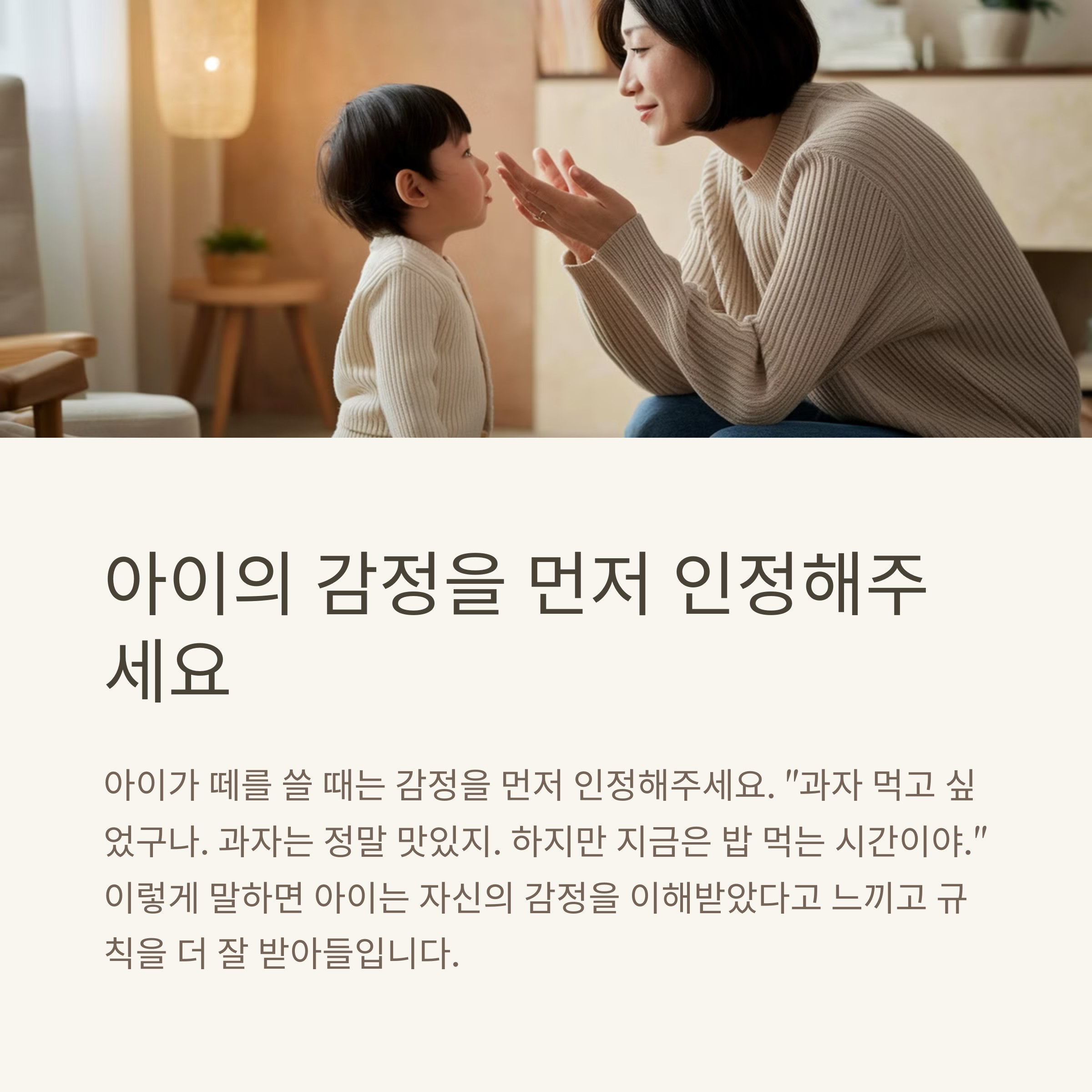 아이가 울거나 떼를 쓸 때, 부모님은 감정을 다독이면서도 원칙을 굳건히 해야 합니다. 울음은 아이가 감정을 표현하는 자연스러운 방식이므로, 이를 억지로 막으려고 하지 마세요. 대신, 아이를 부드럽게 안아주거나, “엄마는 네가 행복했으면 좋겠어”와 같은 위로의 말을 전해 아이의 감정을 진정시키세요.