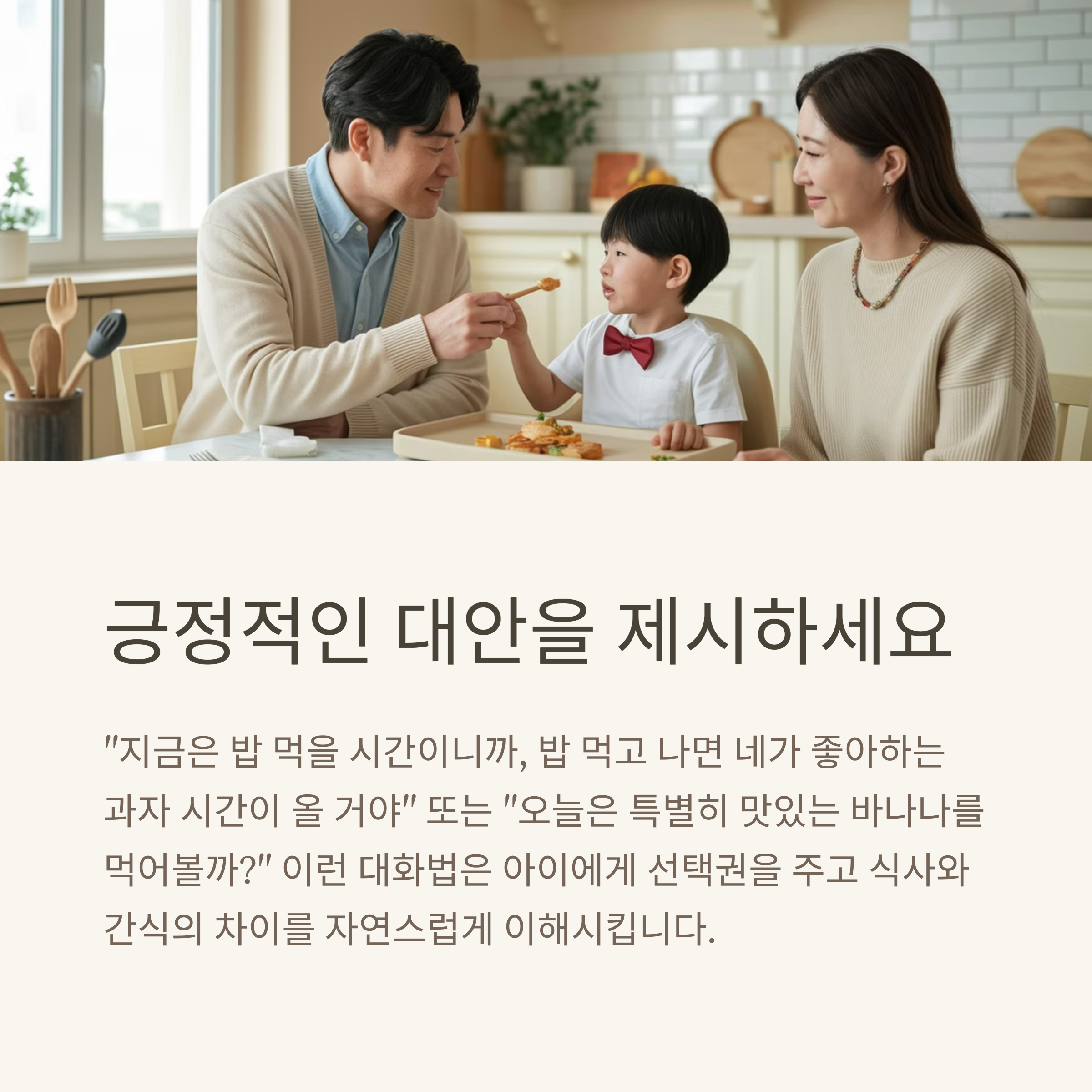 간식의 양은 적당히 조절하고, 건강한 간식(예: 과일, 치즈, 플레인 요거트 등)을 선택해 주세요. 또한, 간식 시간을 규칙적으로 정해두면 아이는 "지금은 간식 시간이 아니야"라는 것을 자연스럽게 인식하게 됩니다.