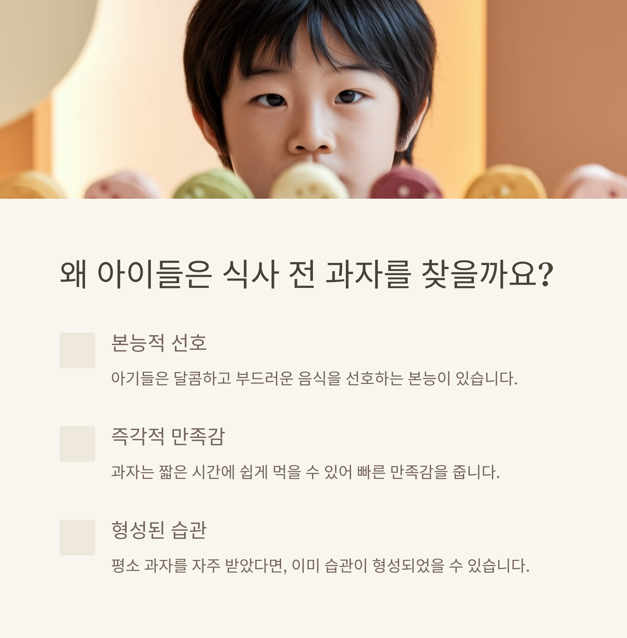 부모님께서는 아이의 이러한 행동을 이해하는 동시에, 식사 시간이 올바른 식습관 형성에 매우 중요하다는 점을 인식해야 합니다. 단순히 과자를 주지 않는다고 해서 문제가 해결되는 것이 아니라, 아이의 감정과 욕구를 적절히 수용하면서 올바른 대안을 제시하는 것이 관건입니다.