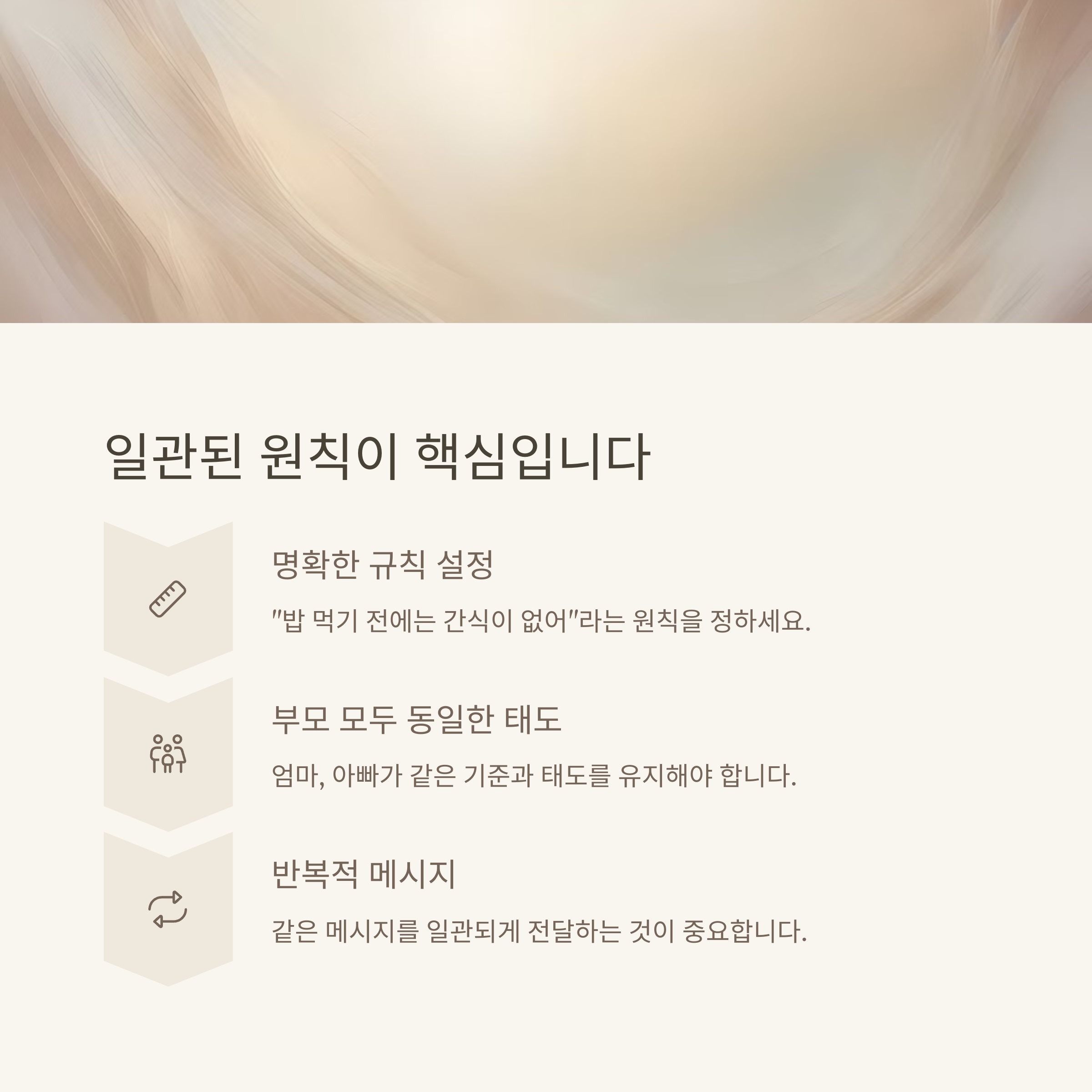처음에는 “밥 안 먹으면 과자 없어요”라고 말하면서도 때때로 과자를 준다면, 아이는 그 상황을 기억하고 더 강하게 요구할 가능성이 높습니다. 따라서 엄마, 아빠가 모두 같은 기준과 태도를 유지하며, 반복적으로 같은 메시지를 전달하는 것이 핵심입니다. 예를 들어, “우리는 식사 시간이 되면 맛있는 음식을 함께 먹기로 약속했어”라고 말하며 확고하게 원칙을 고수하세요.