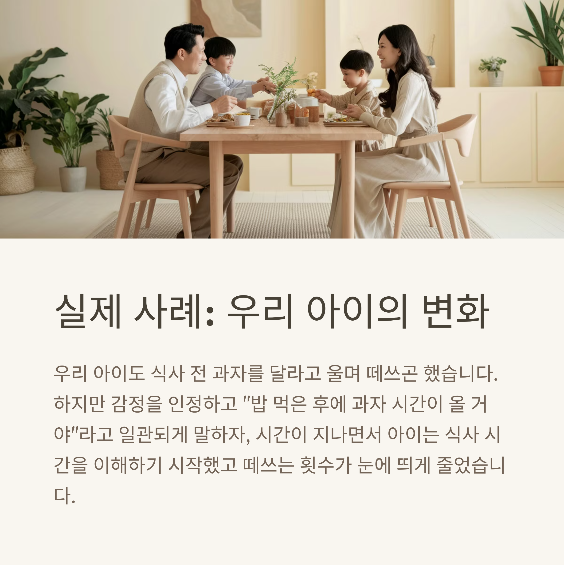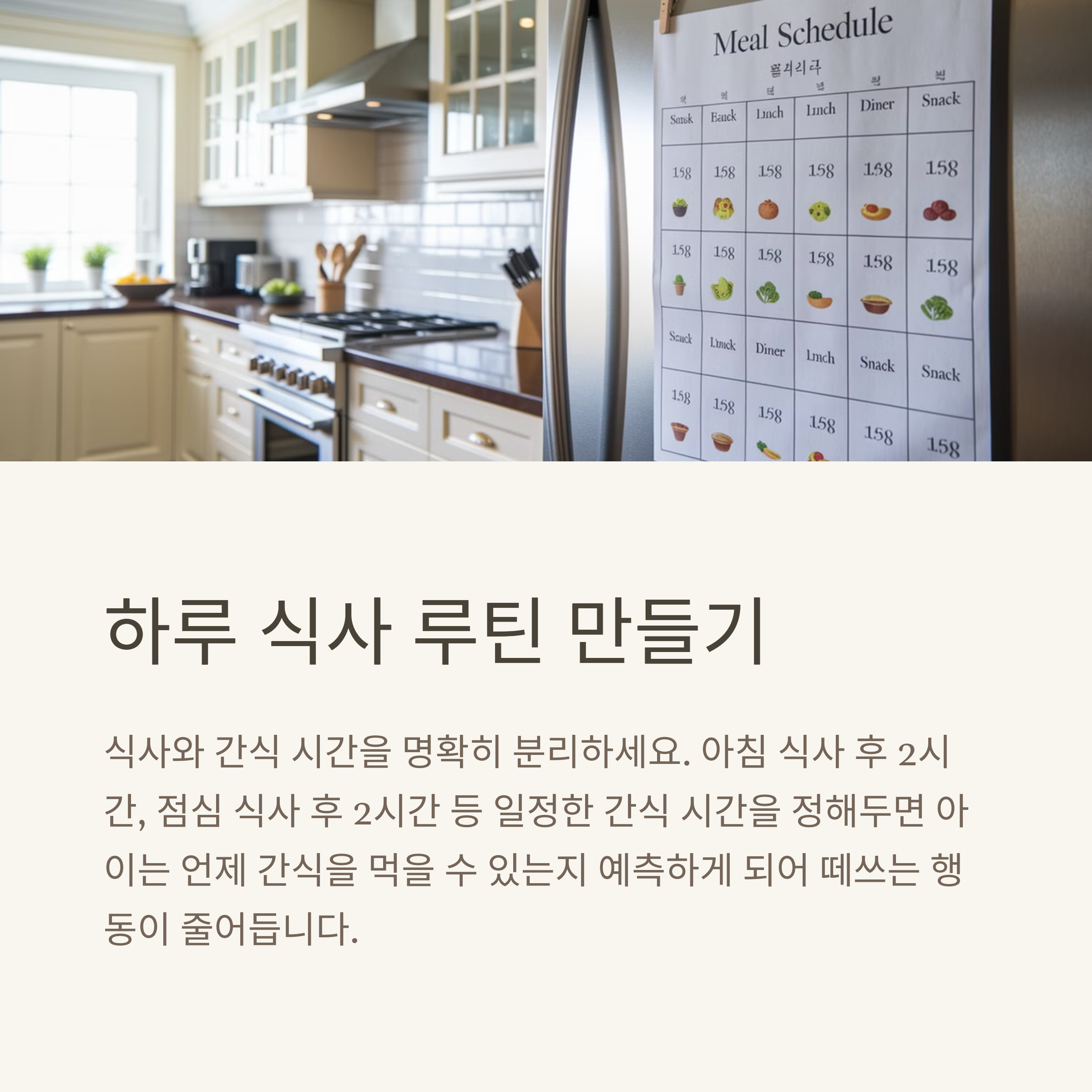 저희 가족은 매일 같은 시간에 간식을 주는 루틴을 만들었고, 아이도 그 시간만큼은 과자를 요구하지 않게 되었어요. 식사와 간식 모두 정해진 시간에만 주면 아이가 “지금은 간식 시간이 아니야”라는 인식을 갖게 되어 떼쓰는 빈도가 현저히 줄어듭니다.