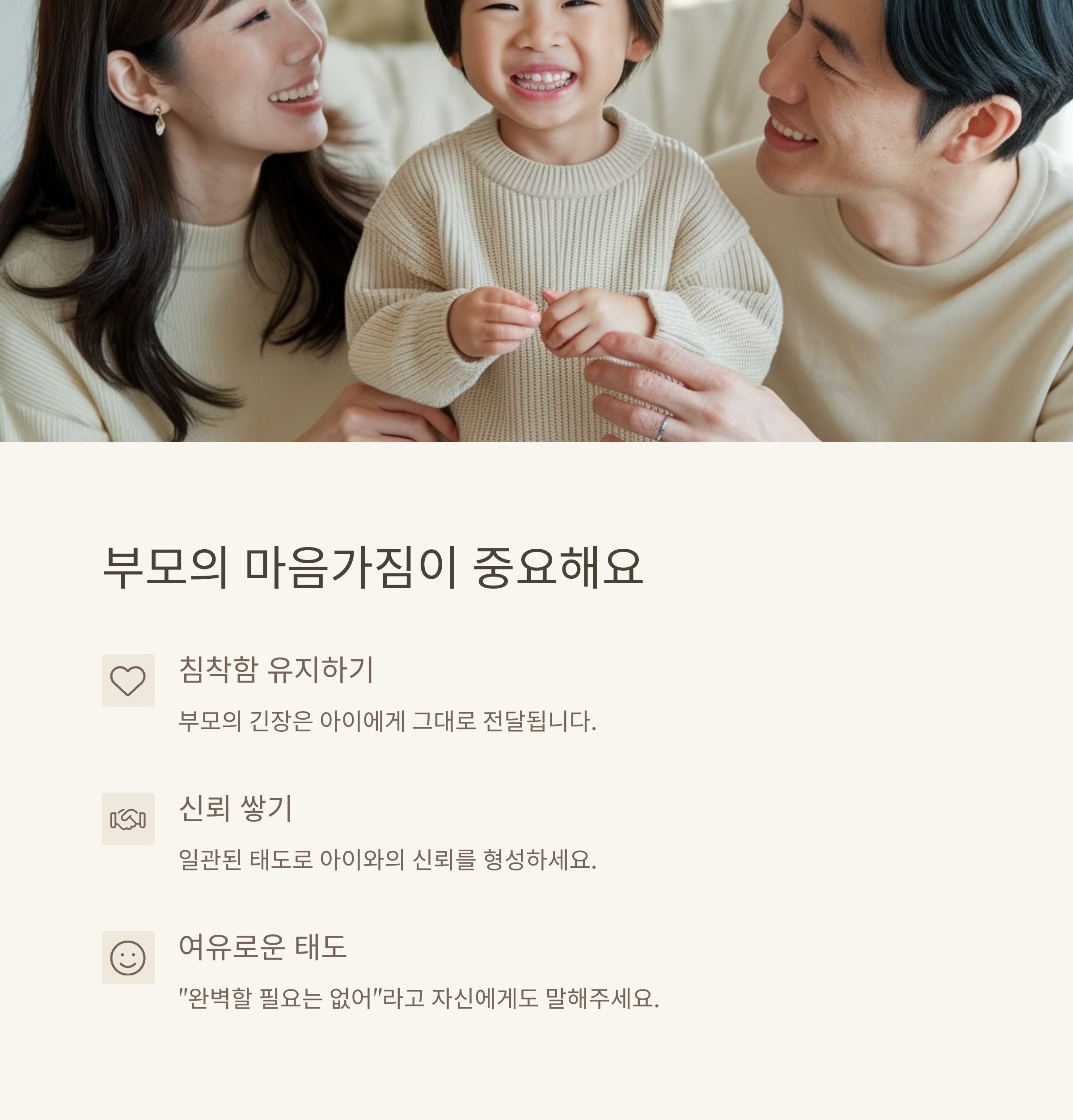“엄마, 아빠도 힘들어하지만, 우리가 함께 이 시간을 지키자”라는 마음으로 아이와 소통하고, 때로는 자신에게도 “완벽할 필요는 없어”라고 말해주는 것이 좋습니다. 부모의 여유로운 태도가 아이에게 안정감을 주며, 시간이 지나면서 자연스럽게 변화가 생깁니다.