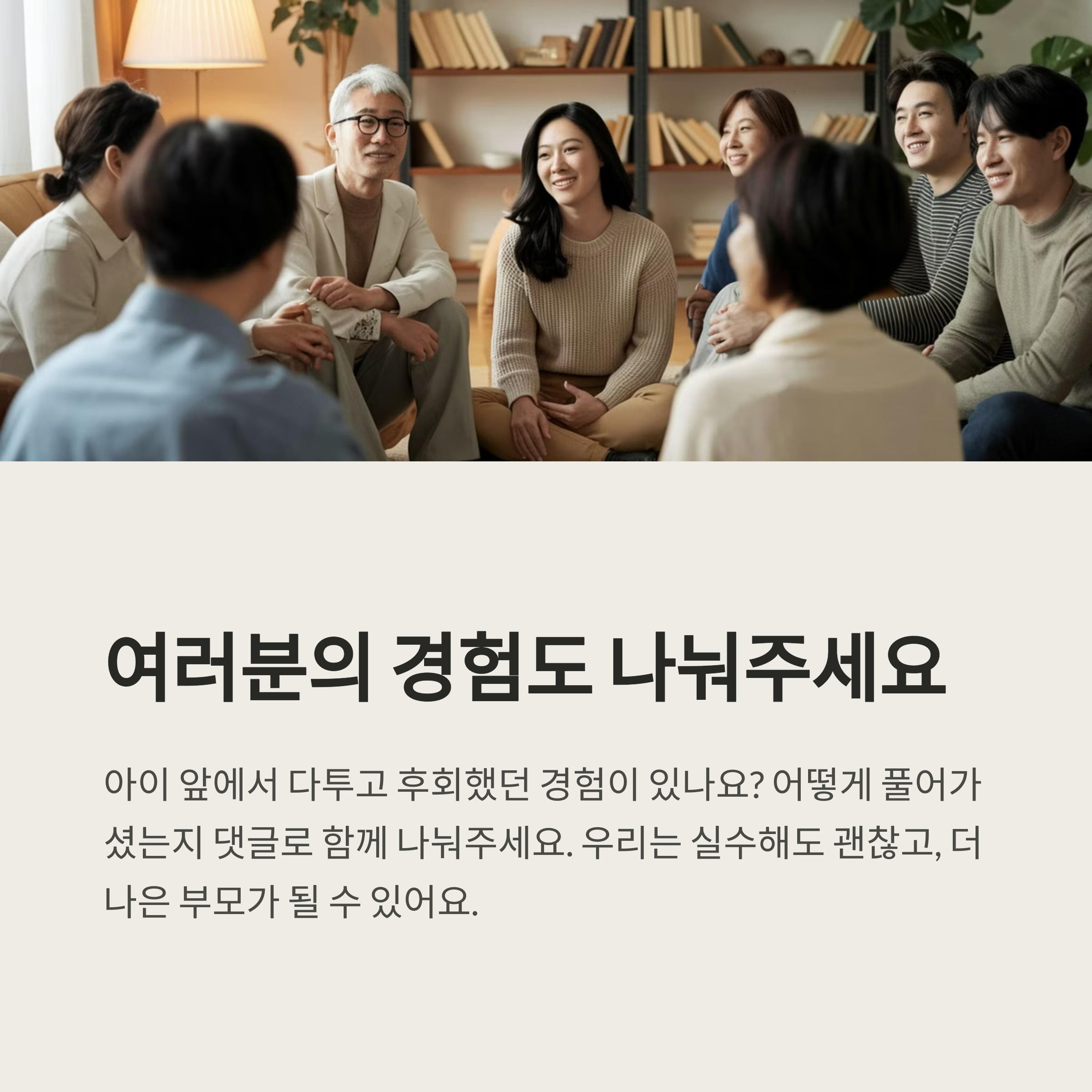 혹시 여러분도 아이 앞에서 다투고 후회했던 경험이 있나요? 어떻게 풀어가셨는지, 어떤 말을 아이에게 건넸는지 댓글로 함께 나눠주세요. 여러분의 이야기가 또 다른 부모님들에게 큰 위로가 될 거예요. 우리는 실수해도 괜찮고, 더 나은 부모가 될 수 있다는 걸 잊지 마세요. 💬💛