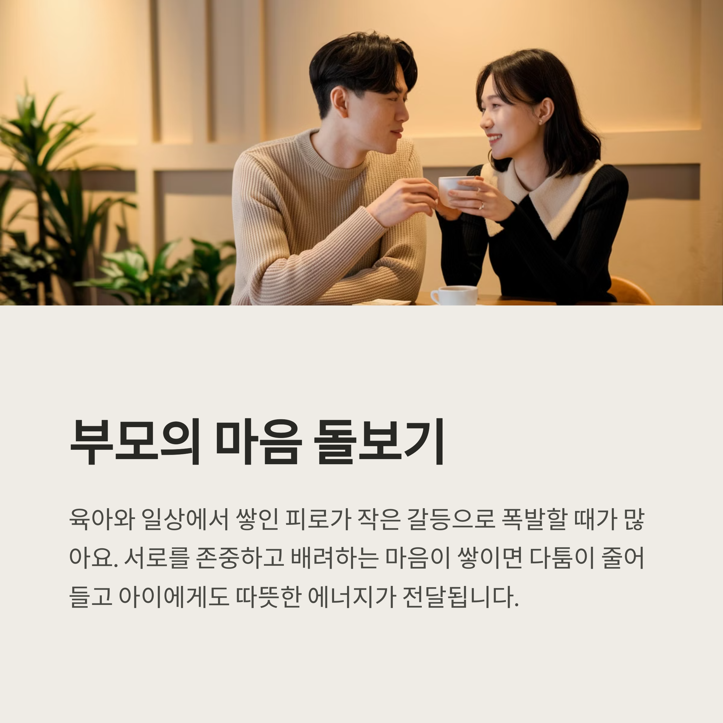 육아와 일상에서 쌓인 피로가 결국 작은 갈등으로 폭발할 때가 많아요. 스스로를 이해하고, 배우자의 입장도 헤아리려는 노력이 필요합니다. 완벽한 부부는 없지만, 서로를 존중하고 조금 더 배려하는 마음이 쌓이면 다툼이 줄어들고, 아이에게도 따뜻한 에너지가 전달돼요. 서로의 고생을 인정하는 한마디 “수고했어”가 정말 큰 힘이 됩니다. 🌿