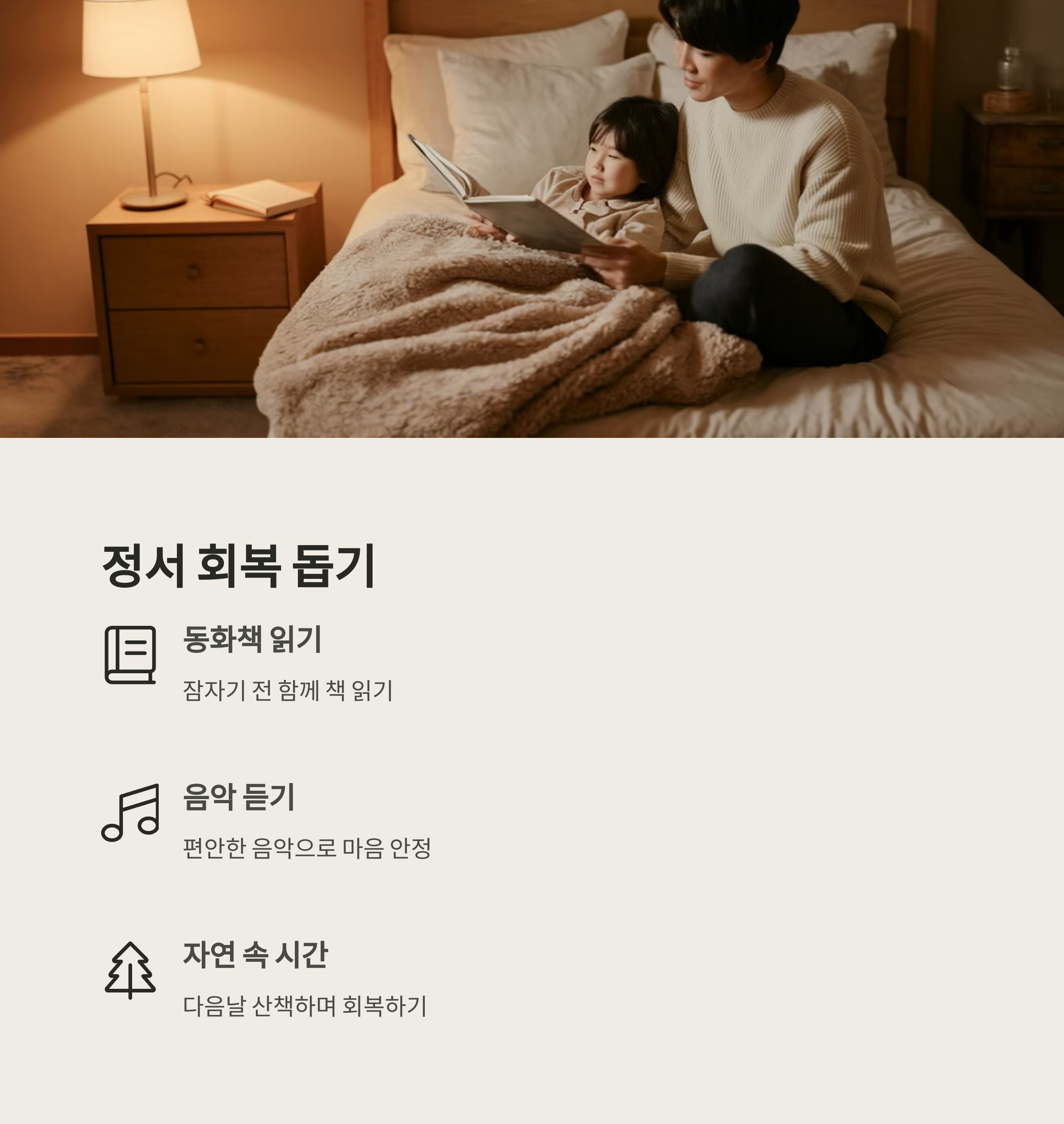 - 🛏 안아주고 “엄마는 항상 너 옆에 있어”라는 반복적인 안심 말