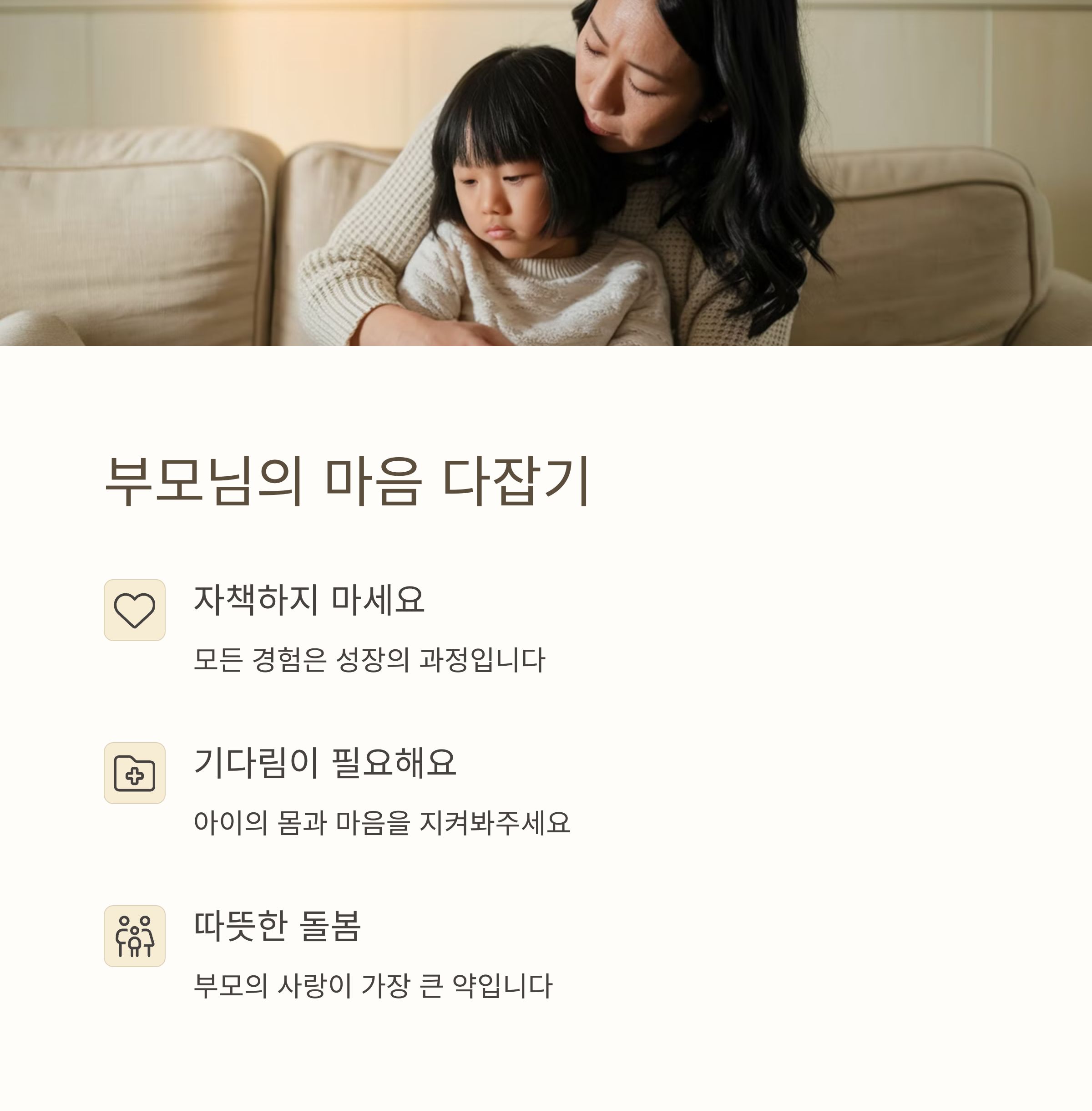 아이가 배가 아프다고 울면 부모 마음은 금세 무너질 수 밖에 없어요. 나도 모르게 자책하고, “내가 더 잘 챙겼어야 하나?” 하는 생각이 드실 거예요. 하지만 아이는 처음 세상에 태어나 모든것을 하나하나 배우는 중이에요. 모든 경험은 성장의 과정이고, 부모의 따뜻한 돌봄과 기다림이 가장 큰 약입니다. 저 역시 그 과정을 지나며 아이와 함께 성장했어요. 여러분도 조급해하지 말고, 천천히 아이의 몸과 마음을 지켜보며 함께 걸어가보세요. 🌷