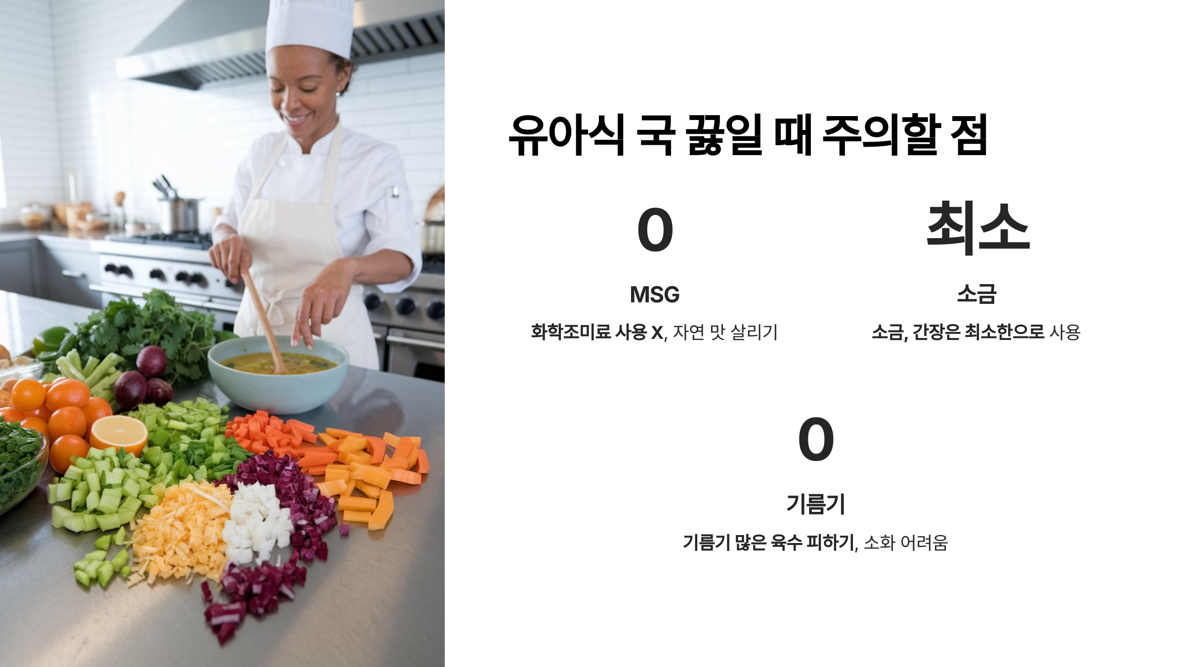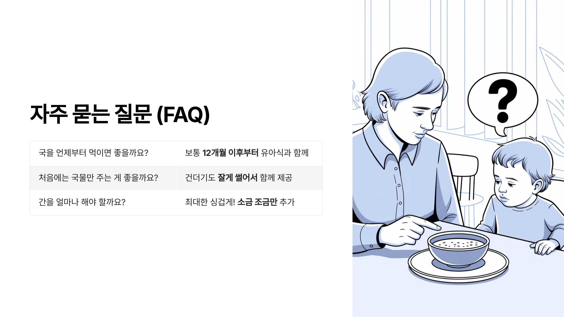 특히, 이유식이 끝난 후 처음으로 먹는 국은 너무 짜거나 기름지지 않게 조리하는 것이 중요해요. 부드러운 채소, 잘게 찢은 고기 등을 활용하면 씹는 연습도 되고, 소화 부담도 줄일 수 있답니다!