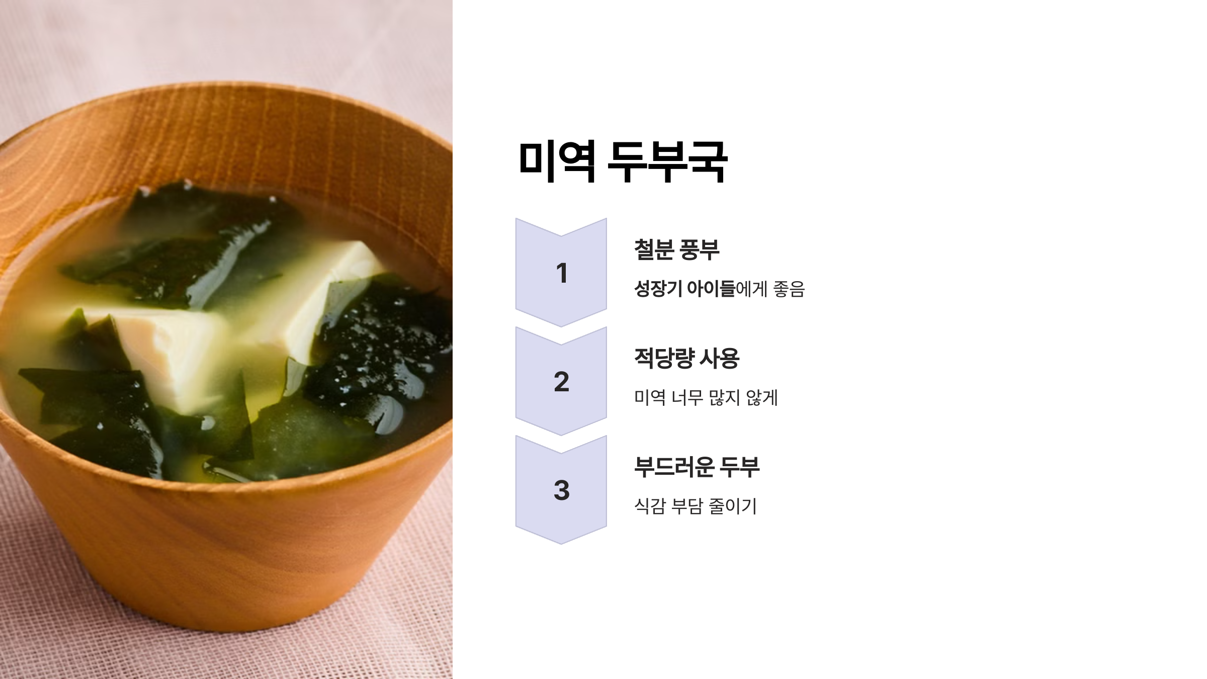 미역은 철분이 풍부해서 성장기 아이들에게 좋은 음식이에요.