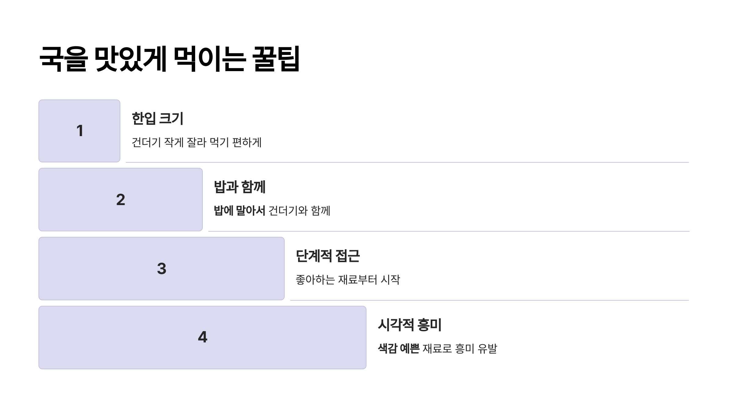 - 🥄 색감이 예쁜 재료를 넣어 시각적인 흥미 유발