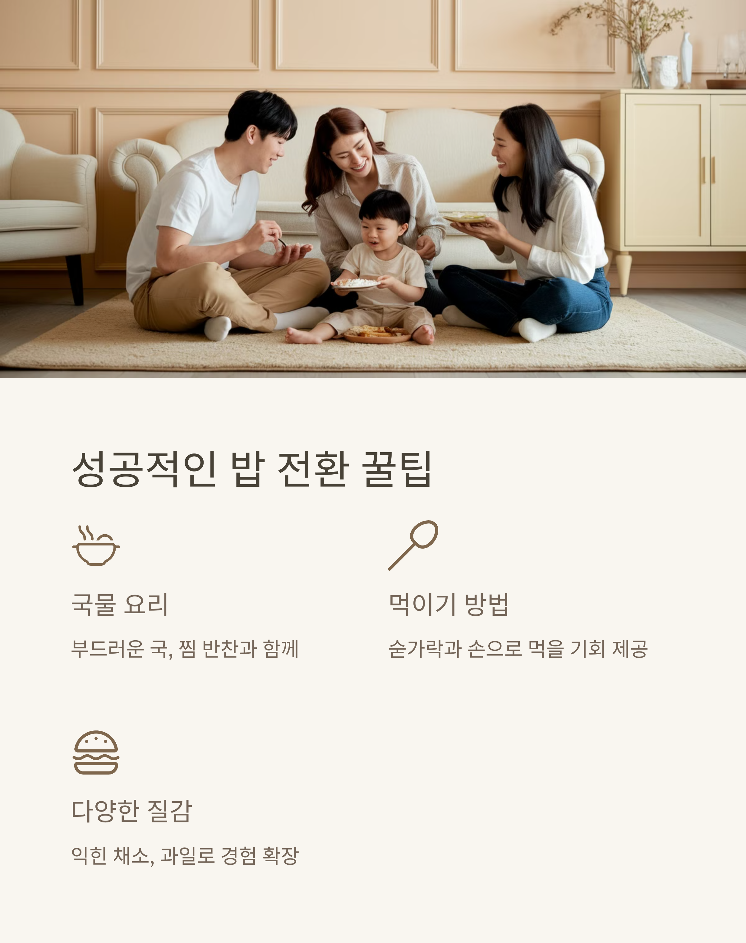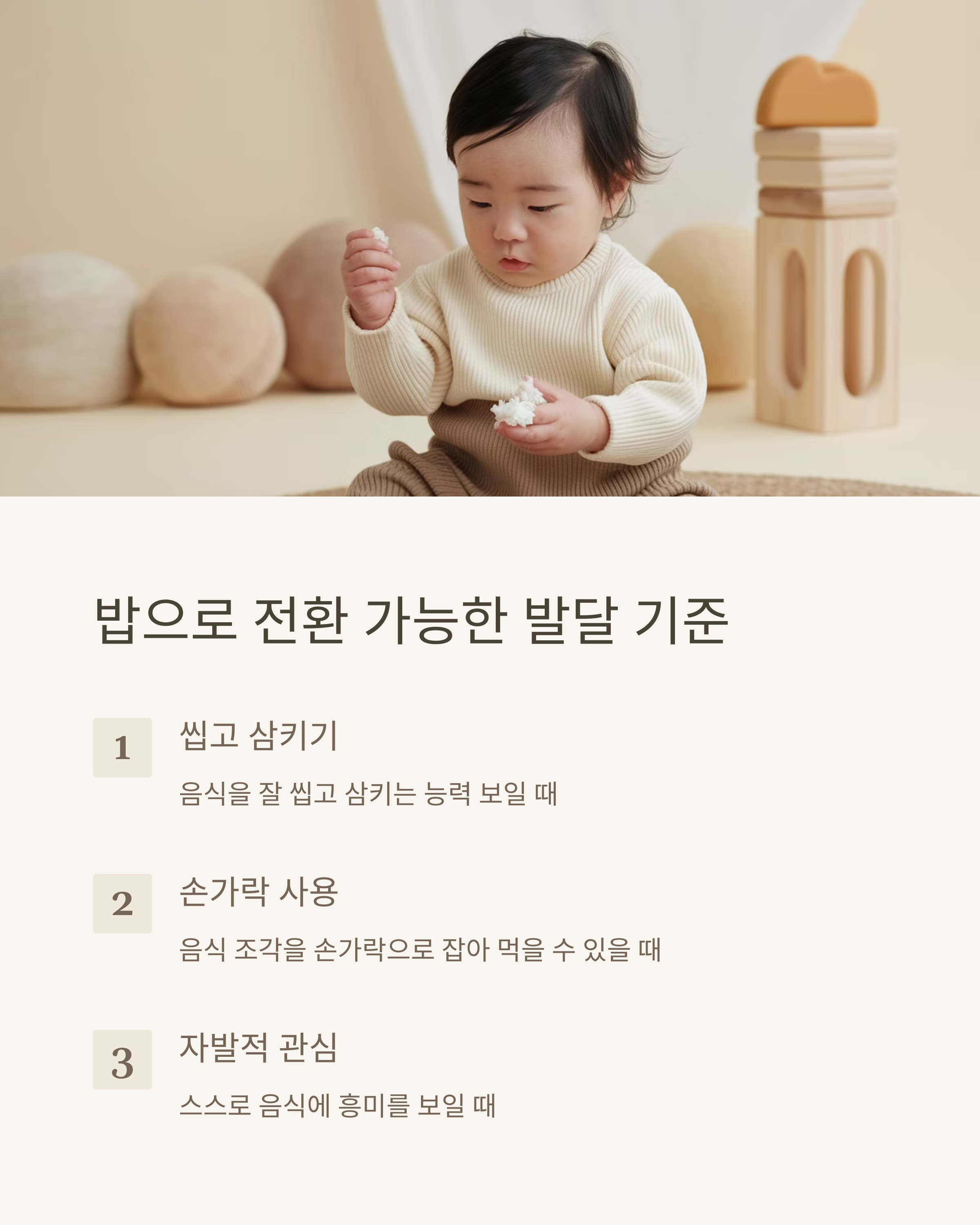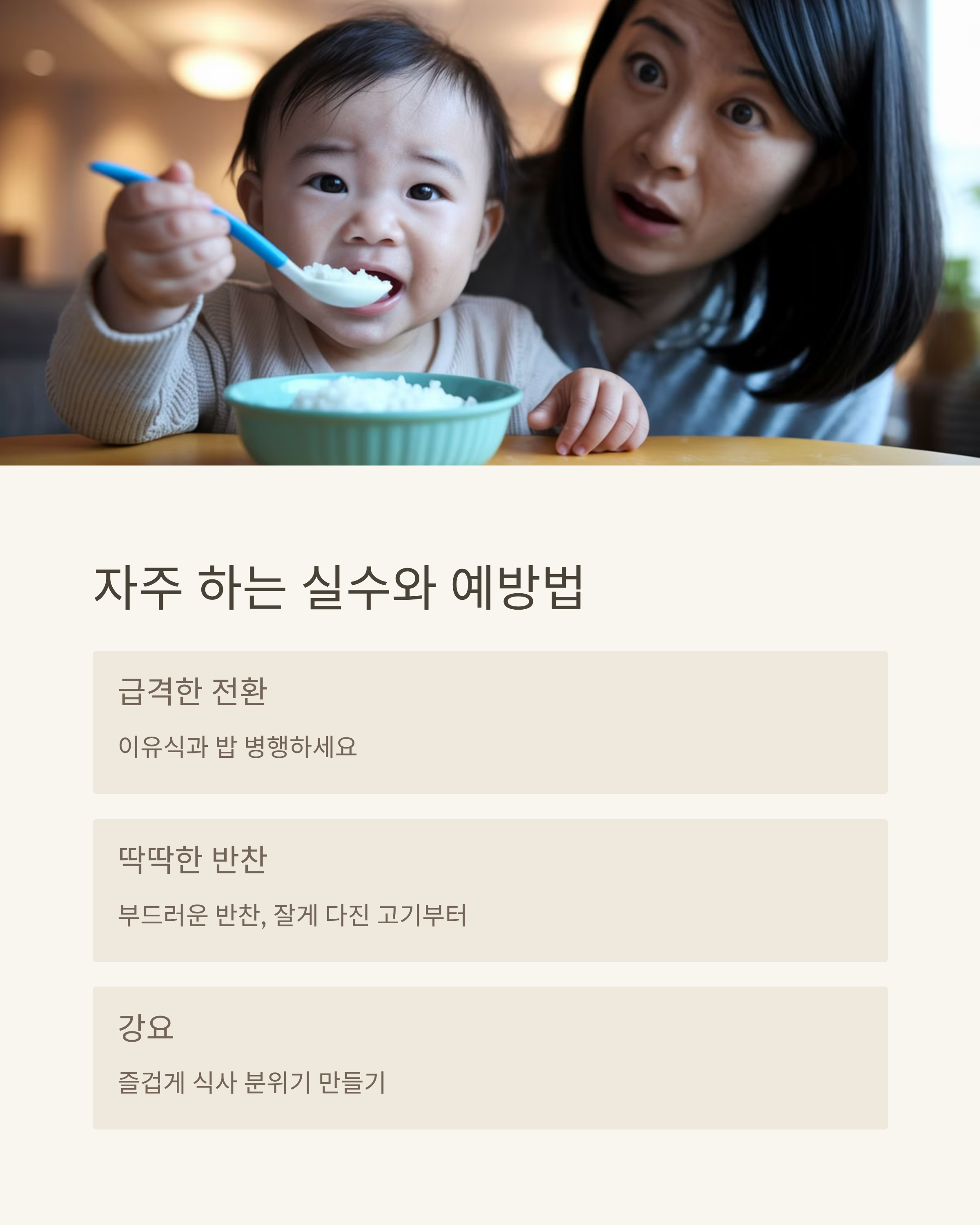 - ⚠ 너무 급격하게 밥으로 완전 전환 → 처음엔 이유식과 밥을 병행하세요.