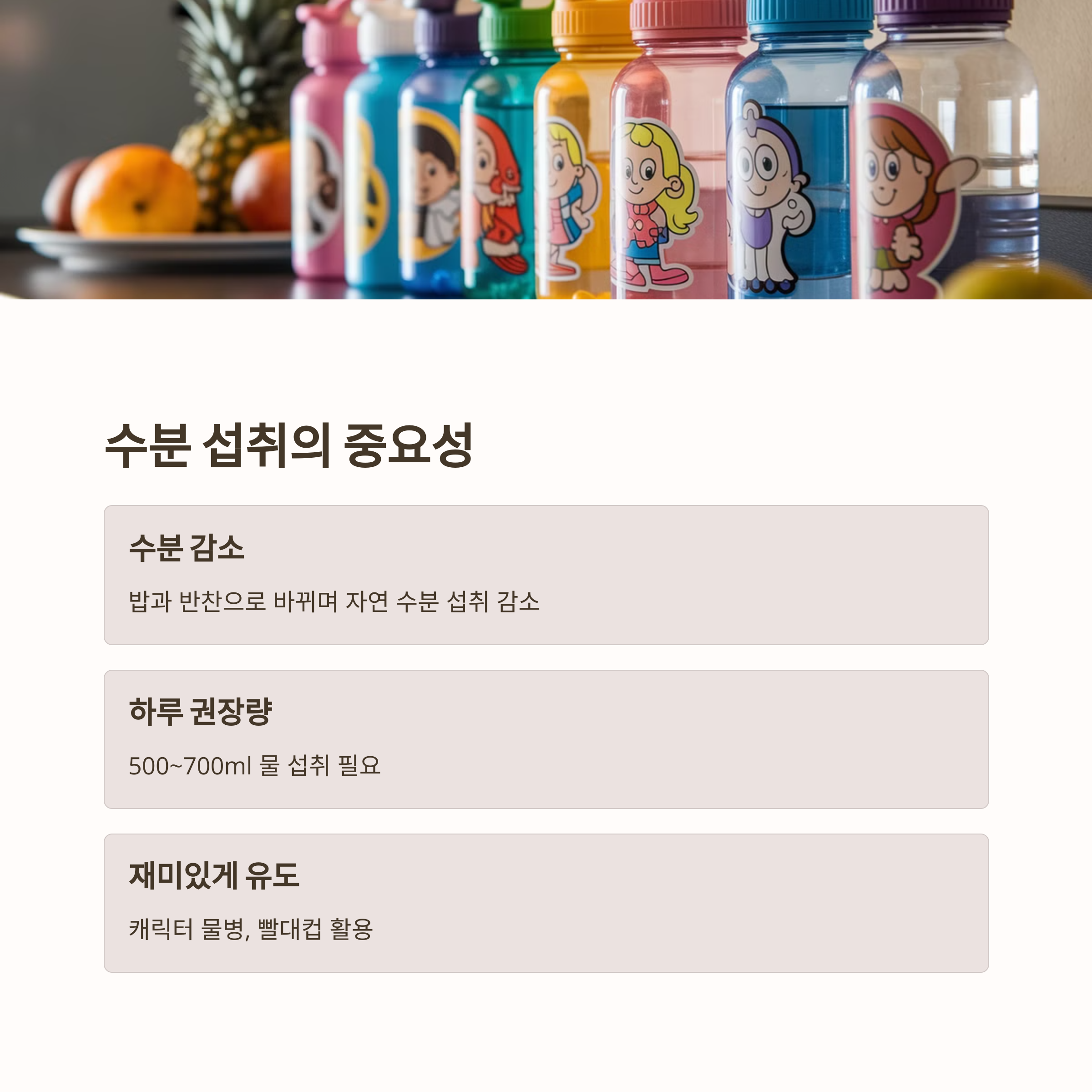 아기의 장 건강에 있어 수분은 정말 중요해요. 이유식 때는 죽 속에 물이 충분히 포함되어 자연스럽게 수분 섭취가 되었지만, 밥과 반찬으로 바뀌면 수분 섭취량이 줄어들기 쉽습니다. 아이가 물을 잘 마시지 않는다면 변은 점점 딱딱해지고 배출이 어려워집니다. 저는 아이가 물을 거부할 때 빨대컵, 동물 캐릭터 물병을 활용해 재미있게 물 마시게 유도했어요. 하루 수분 권장량은 500~700ml 정도로 충분히 채워주셔야 해요. 💧