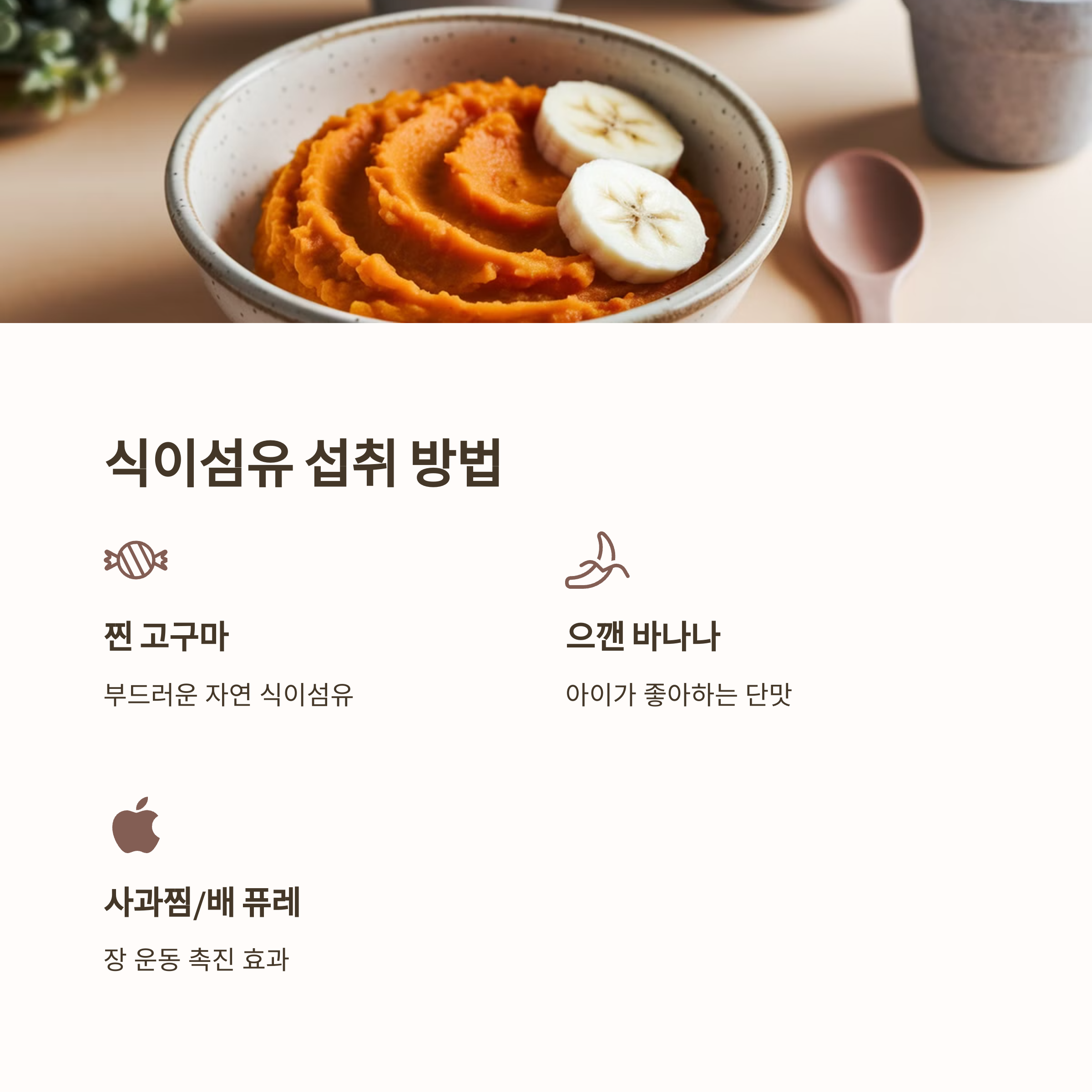 - 🍠 찐 고구마, 바나나, 배 등 부드러운 섬유질 음식