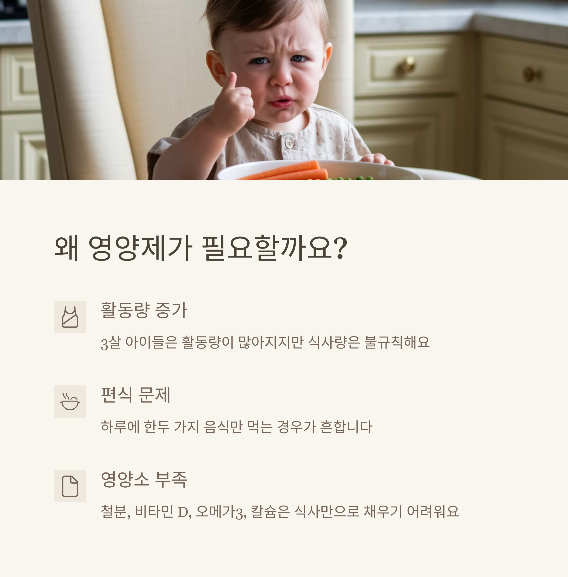 편식이 심하고 입맛이 까다로운 3살 아기를 보면, “이거 다 먹고 크는 거 맞아?” 싶은 생각이 들죠. 저도 매끼니 아이가 밥 두어 숟가락만 먹고 도망갈 때마다 속이 타들어갔어요. 그때부터 자연스럽게 “영양제라도 챙겨야 하나?” 하는 고민이 시작됐답니다. 하지만 시중에는 너무 많은 영양제가 있고, 어떤 게 정말 우리 아이에게 필요한지 알기 어려웠어요. 오늘은 3살 아기에게 필요한 영양제, 선택 기준, 실제 후기를 바탕으로 한 따뜻한 조언을 나눠볼게요. 😊