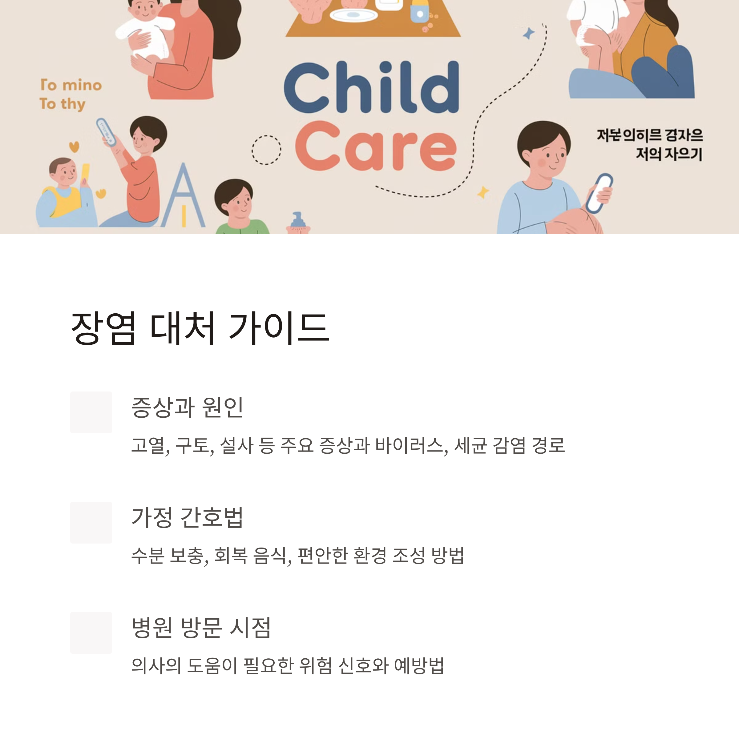 아이의 장염은 부모에게도 큰 시험이에요. 지치고, 걱정되고, 때로는 죄책감도 생기죠. 하지만 꼭 기억해 주세요. 지금처럼 아이 옆에서 최선을 다하고 있는 부모님의 모습만으로도 아이는 큰 안정과 사랑을 느끼고 있다는 걸요. 완벽하지 않아도 괜찮아요. 충분히 잘하고 계십니다. 💕
