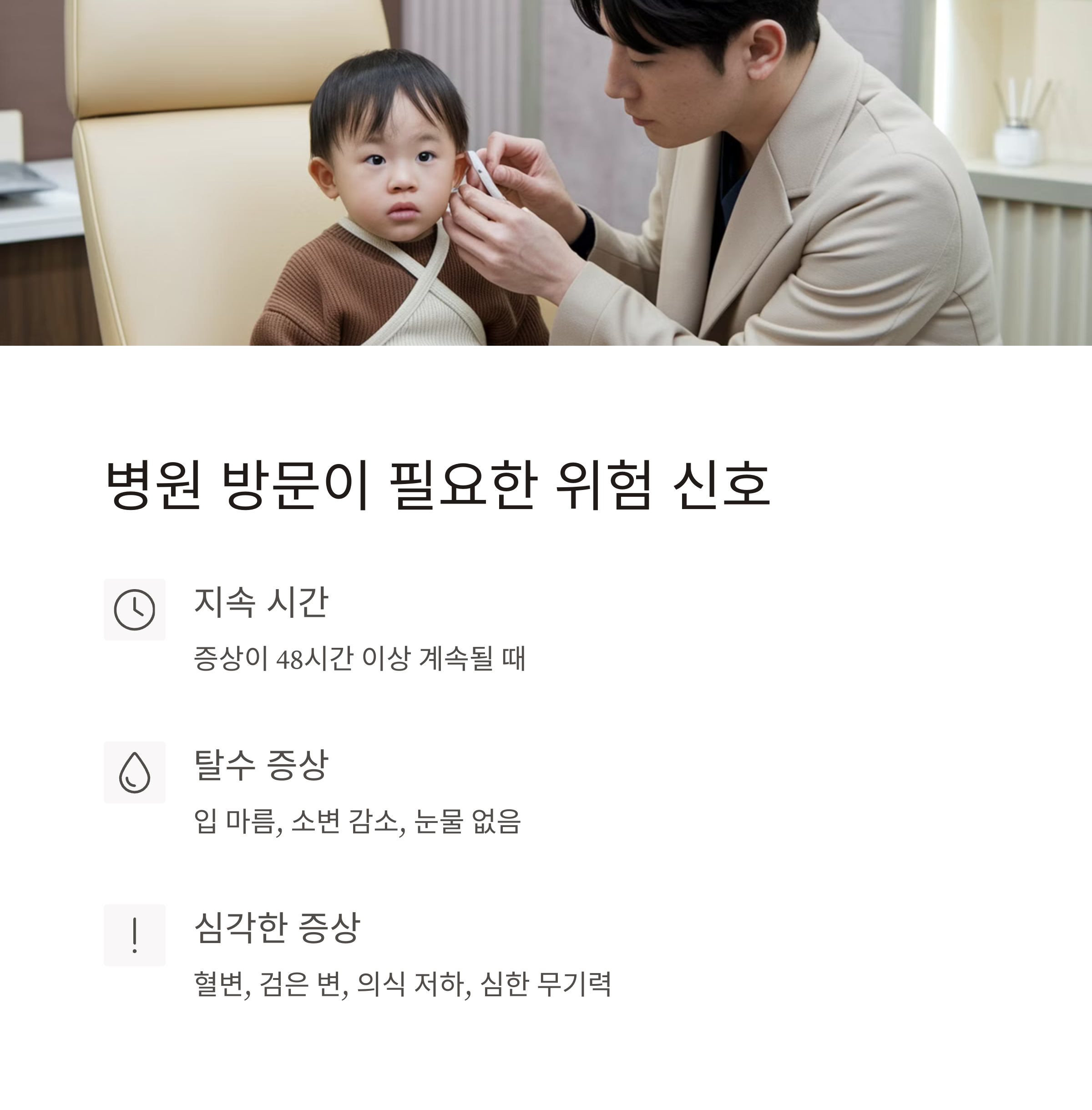- 💧 탈수 의심 (입 마름, 소변 적음, 눈물 없음)