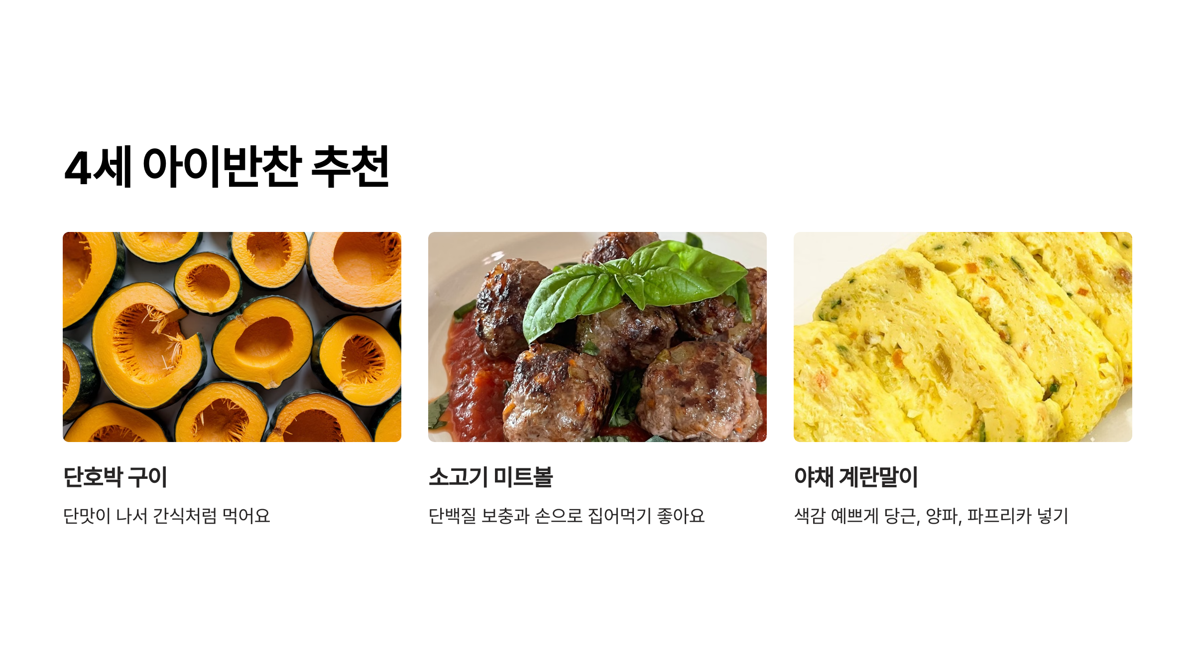 - 4세: 자연스러운 단맛과 다양한 식감을 경험 (단호박, 브로콜리 등)