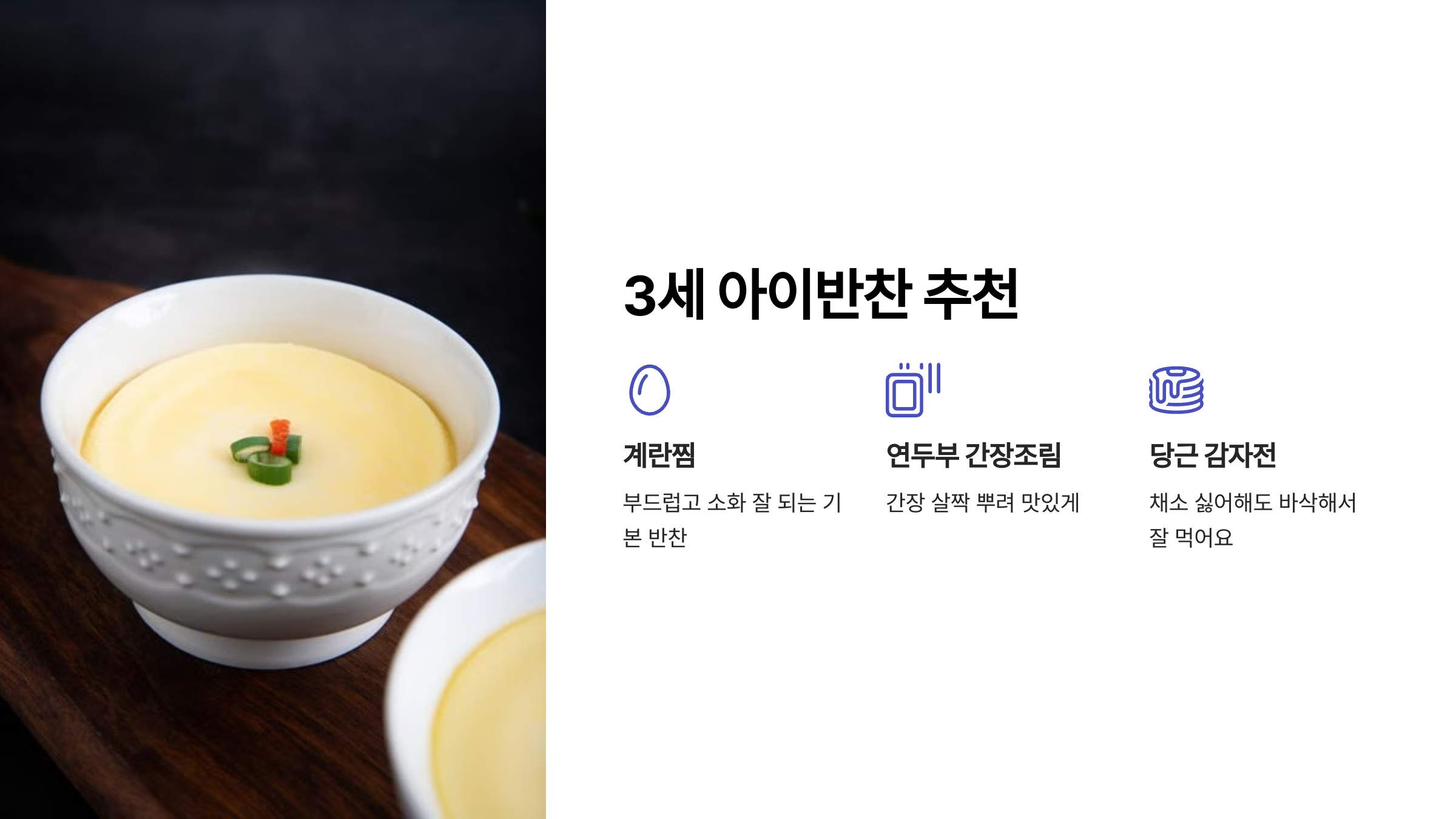 - 3세: 부드럽고 씹기 쉬운 음식 위주 (계란찜, 두부 등)